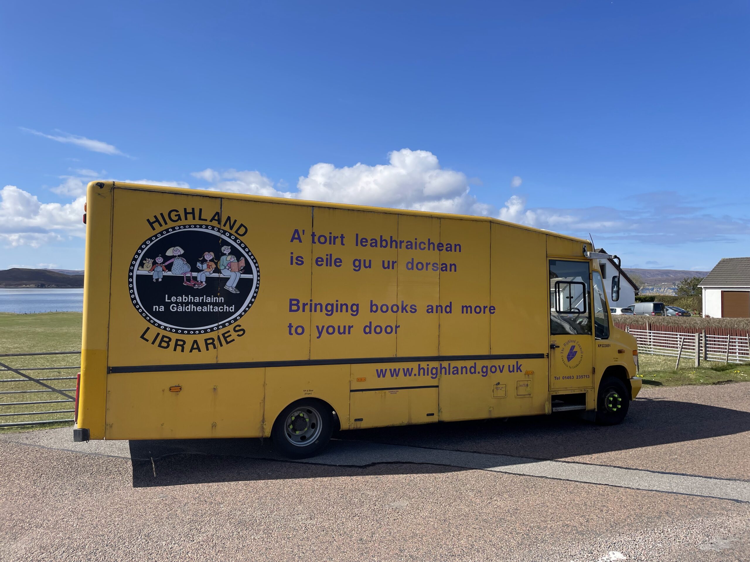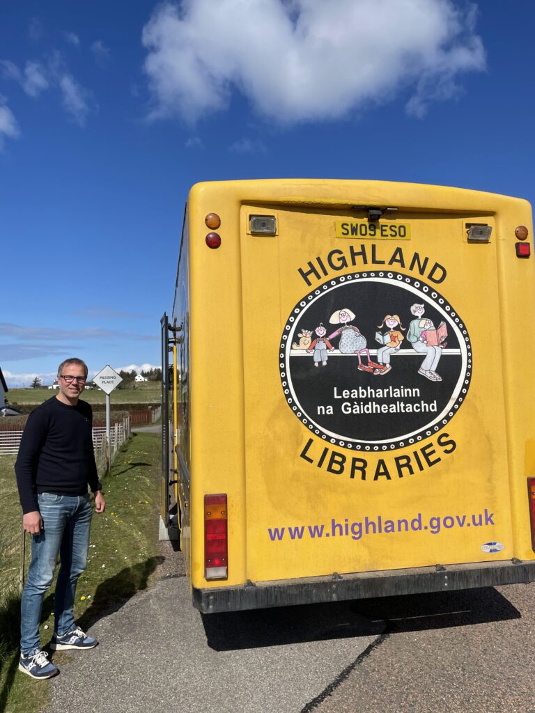 Het is de bibliotheek bus die vandaag het dorp aandoet. We raken aan de praat met de chauffeur en bibliothecaris, dezelfde persoon. Het is een jonge vent met duidelijk geen Schots accent. Weer iemand die oorspronkelijk uit Engeland komt en hierheen is verhuisd.